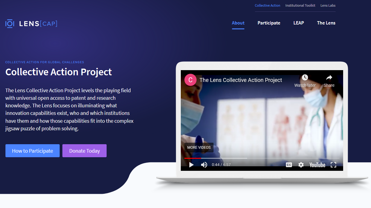 Today, The Lens announces the launch of the Collective Action Project - a multi-year initiative to enable open innovation knowledge for solving problems together. Comprising a massive collection of over 134M global patents linked with 236M research publication records and hundreds of millions of genetic sequences extracted from patents, with powerful analytics, and institutional tools, The Lens is the world's largest science and technology resource for both public sector, civil society and businesses, built on open data.