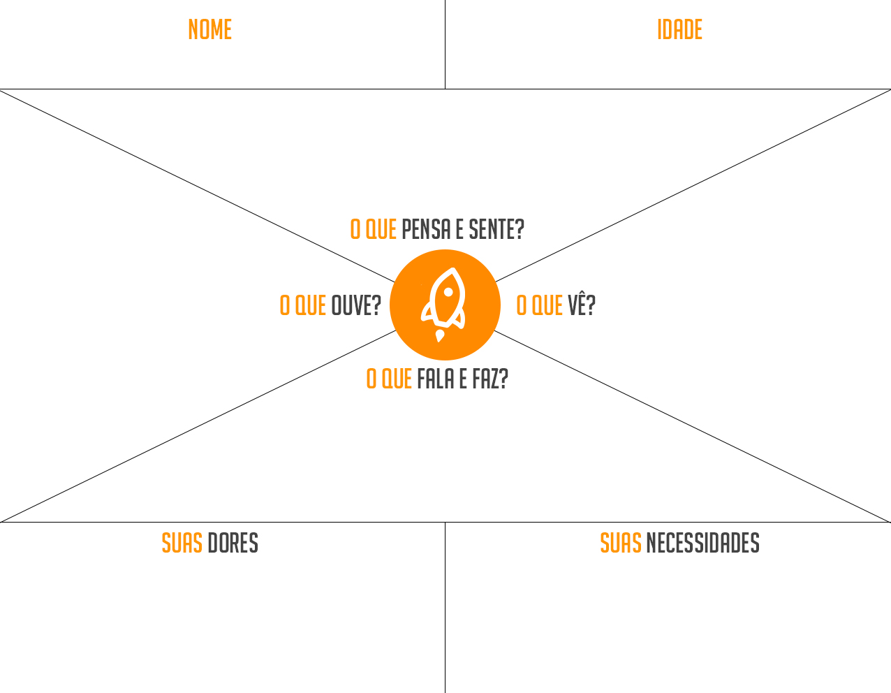 O mapa de empatia irá te auxiliar a desenvolver a sua persona ideal, e isso é baseado em 06 campos principais: